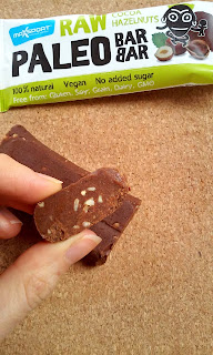 Pierwszy raz na batona od MaxSport natknęłam się ponad rok temu w Tesco. Z dostępnych wariantów (oprócz dzisiaj recenzowanego, na półce znajdował się Coconut & Cashew oraz Apple & Cinnamon), wybrałam tego z kakao i orzechami laskowymi. Były to dopiero początki mojego bloga, a w związku z dość napiętą sytuacją na uczelni, nie znalazłam czasu na jego recenzję. Myślę, że dobrze wyszło - w międzyczasie zmieniono skład, a ja nabrałam literacko-blogowej ogłady :D Postanowiłam jednak popłynąć na fali Raw Paleo od MaxSport i zrecenzować nie tylko batony proteinowe, ale także te, nie zawierające białka.